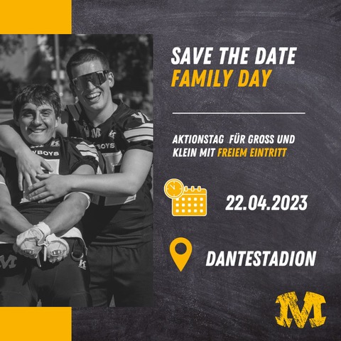 Unser Family Day 2023 ist zum 22. April 2023 geplant. Die Munich Cowboys laden herzlich ein, mit allen Familien und Freunden diesen Tag gemeinsam im Dantestadion zu verbringen. Lasst euch überraschen, es ist vieles geboten!