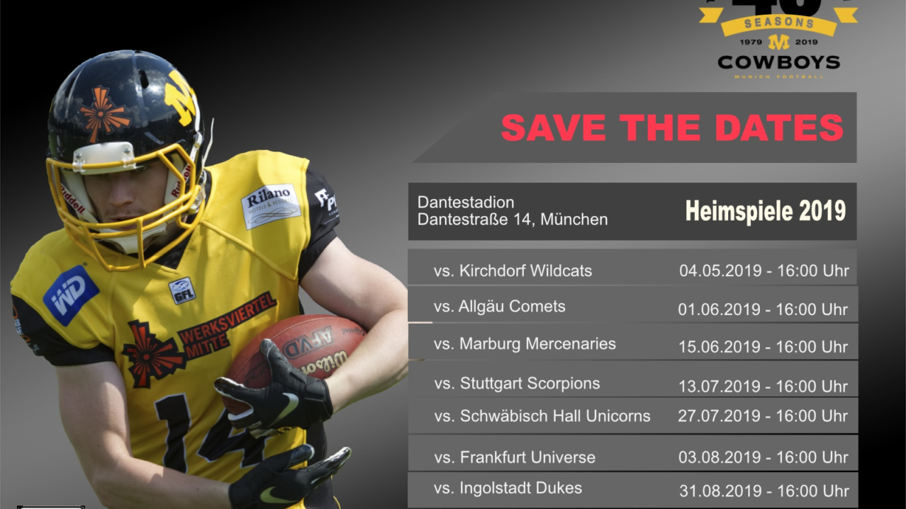 Die Heimspiele der Munich Cowboys in der Hauptrunde der German Football League stehen fest. Erneut kommt es auch 2019 zu drei bayerischen Duellen im Münchner Dantestadion, da mit den Kirchdorf Wildcats, den Allgäu Comets sowie den Ingolstadt Dukes drei…
