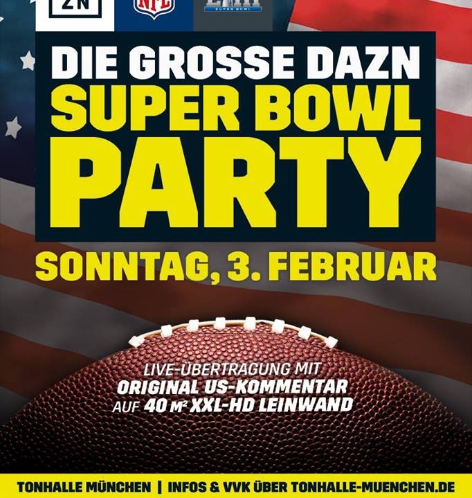 Auch 2019 feiern die Munich Cowboys den Super Bowl wieder in der TonHalle im Werksviertel Mitte. Bei der großen DAZN Super Bowl Party erwartet die Gäste nicht nur die Live-Übertragung mit original US-Kommentar auf 40 m² XXL-HD Leinwand.