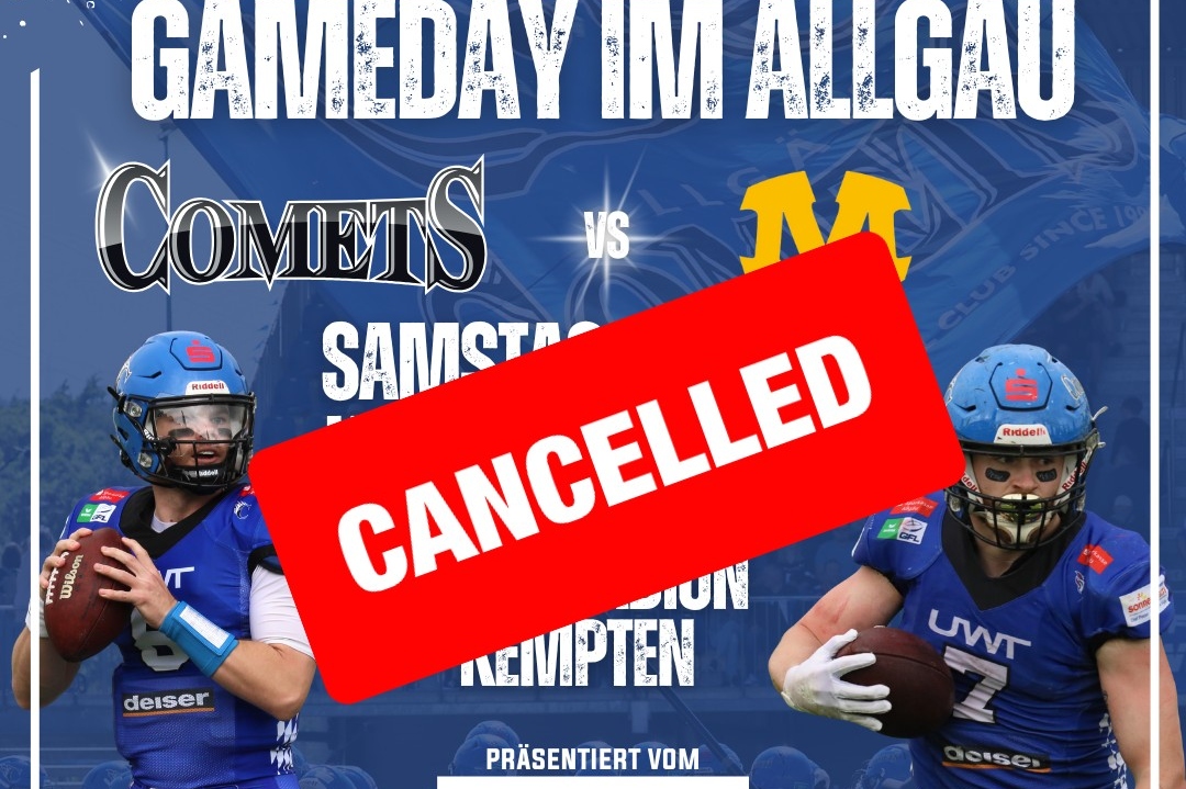 Leider müssen wir euch mitteilen, dass das für Samstag, 26. Juli geplante Auswärtsspiel bei den Allgäu Comets nicht stattfinden kann. Aufgrund der anhaltenden Regenfälle und der Wetterprognosen des Deutschen Wetterdienstes wurden alle Rasenplätze in Kempten ab sofort gesperrt –…