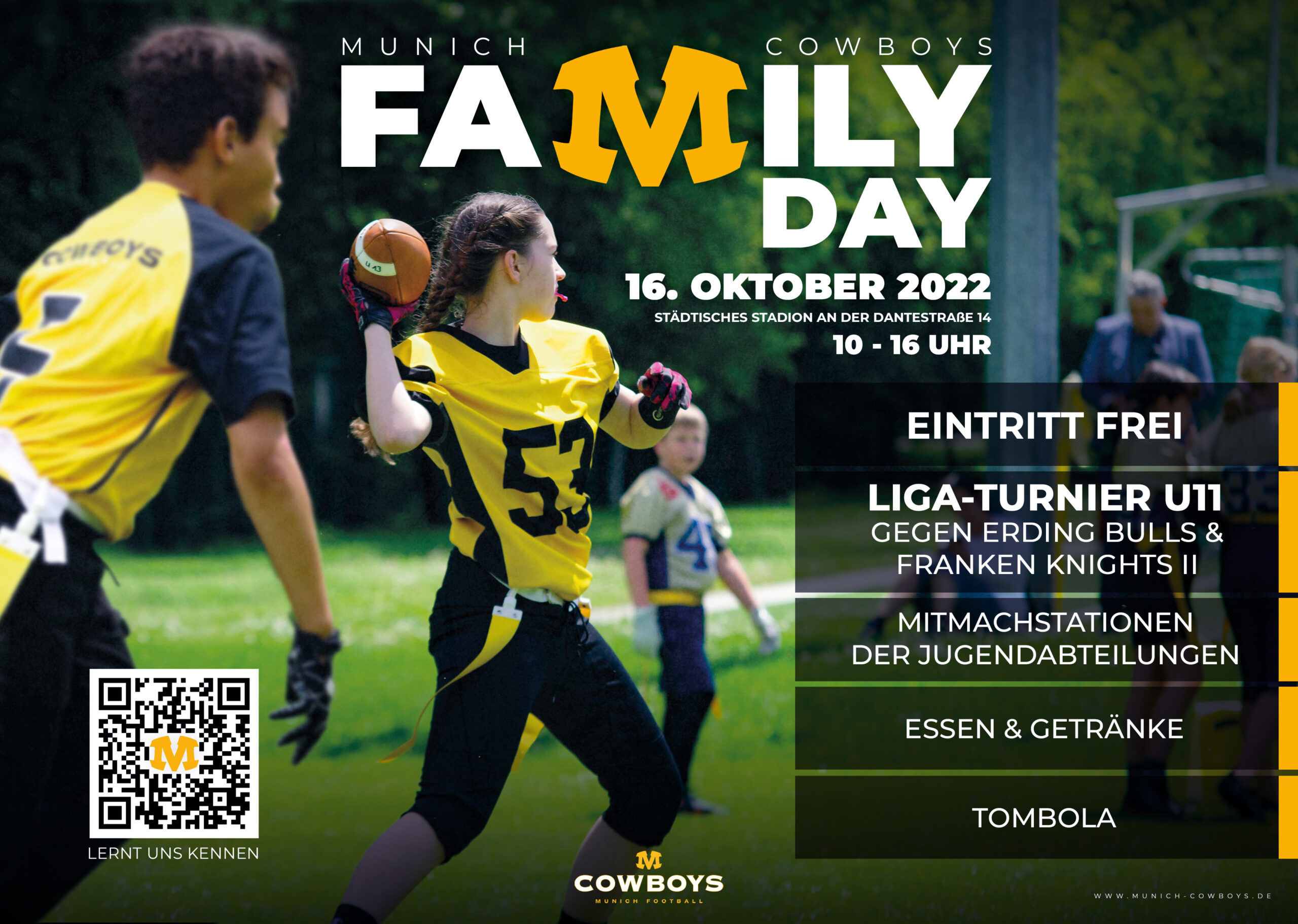 Die Jugend Abteilung der Munich Cowboys veranstaltet am 16.10.2022 im Münchner Dante Stadion einen Family Day.