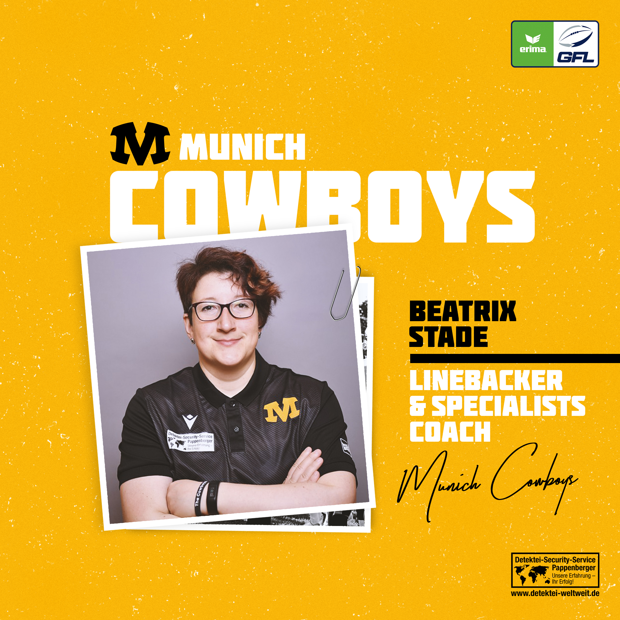 Schon letztes Jahr stand sie als Coach an der Münchener Seitenlinie. Auch 2023 wird Beatrix „Trixi“ Stade ihre Expertise bei den Linebackern und Specialists des GFL Teams der Munich Cowboys einbringen.