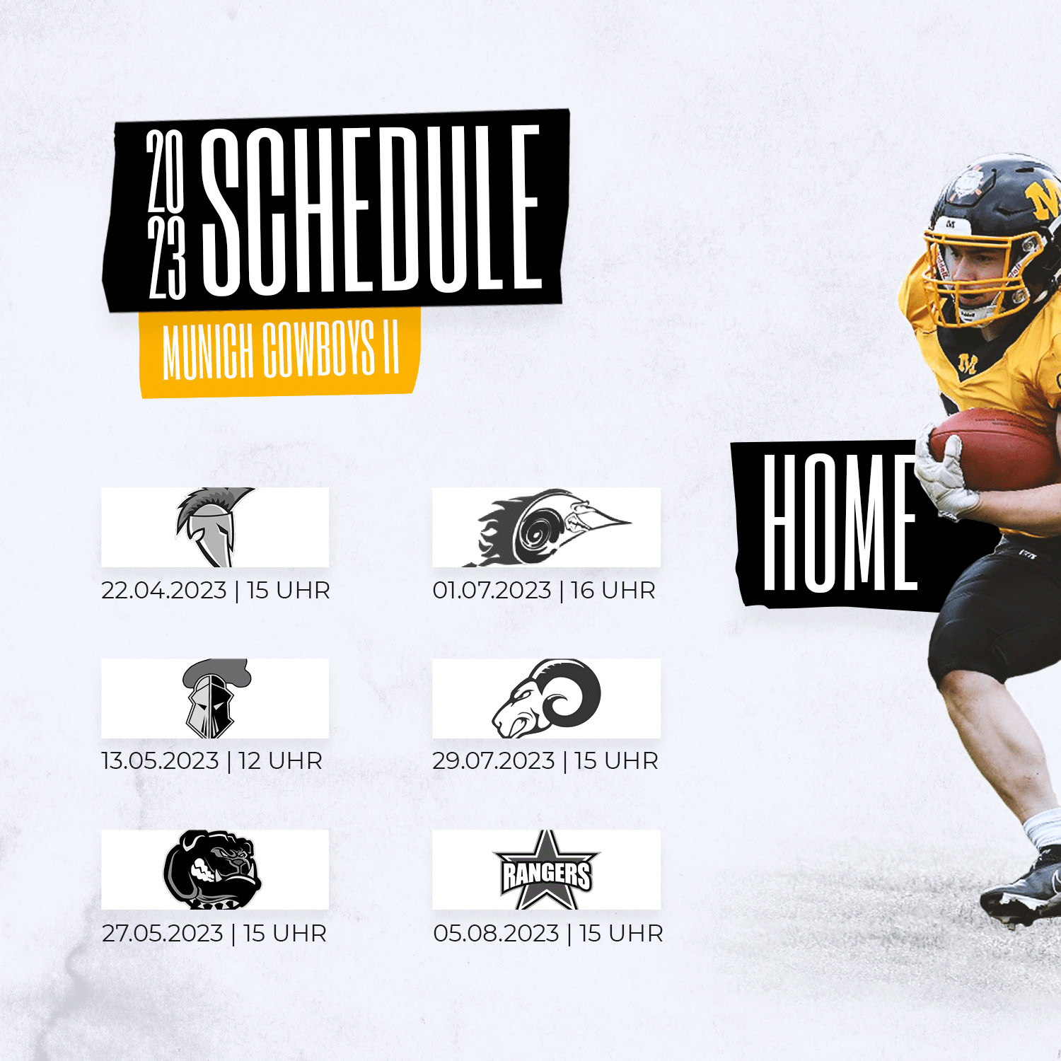 Am Samstag, 22. April starten unsere Munich Cowboys II ihre Saison in der Regionalliga mit dem Heimspiel gegen die Neu-Ulm Spartans. Der Eintritt ist im Rahmen unseres Munich Cowboys Family Days frei.