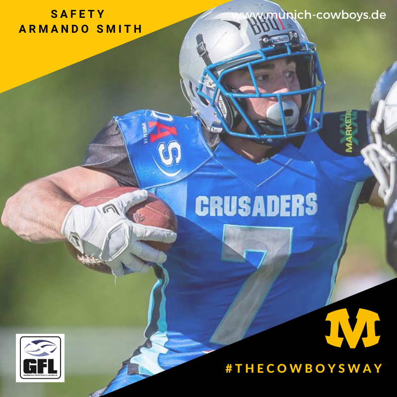 Die Defense der Munich Cowboys bekommt weiteren Zuwachs. Mit Armando (AJ) Smith Jr. wird ein US-Amerikaner die Safety Position bei den Münchnern einnehmen und so die Secondary weiter absichern. Zudem kann Smith als Return Spezialist eingesetzt werden.