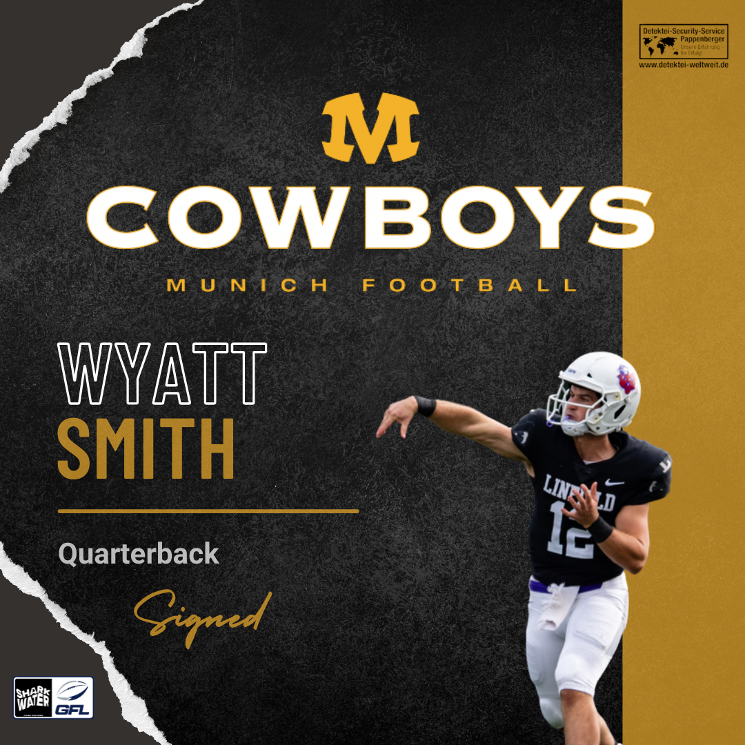 Die Munich Cowboys haben sich für die kommende Spielzeit 2022 in der GFL auf der Quarterback Position für Wyatt Smith entschieden. Mit Wyatt kommt ein sehr flexibler, ambitionierter Spieler nach München, der sowohl einen starken Wurfarm hat, als auch die nötige Beweglichkeit beim Lauf mitbringt. Wyatt empfiehlt sich aus seiner Linfield College Zeit mit hervorragenden Statistiken. Ein kleiner Auszug aus den vergangenen Spielzeiten mit diesen beeindruckenden Werten: Passing Completions – 854, Touchdown-Pässe – 111, Verantwortlich für 120 Touchdowns und eine Passing Completion Rate von 71 Prozent. Dazu kommt noch Platz 2 bei der Wahl der Gagliardy Trophy war, der Auszeichnung für hervorragende College Football Spieler der Division III.