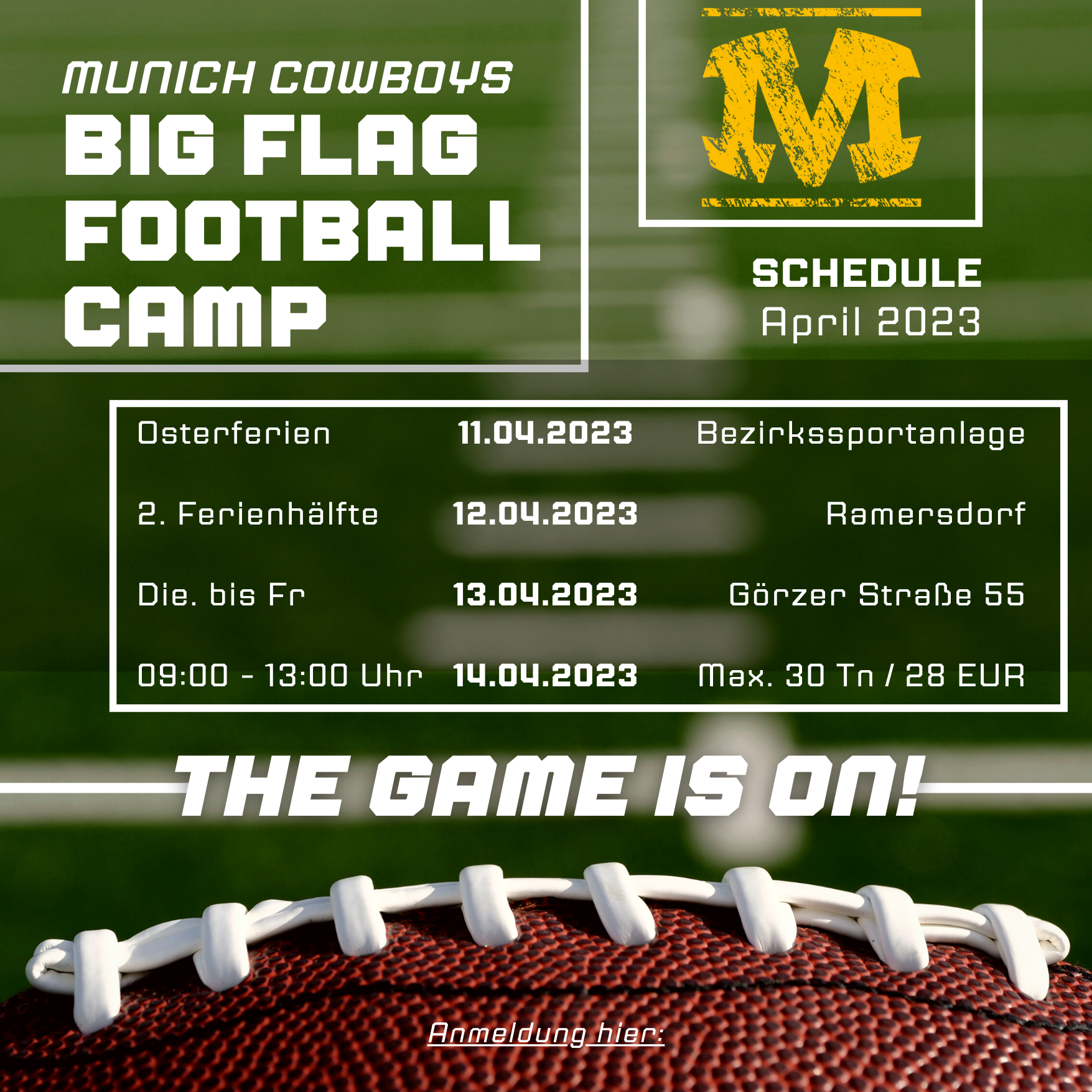 Weitere Infos und der Link zur Anmeldung unter https://club.spond.com/landing/courses/munichcowboys/425F51E8879541D1A8FCA7245D05F1F4/main_products