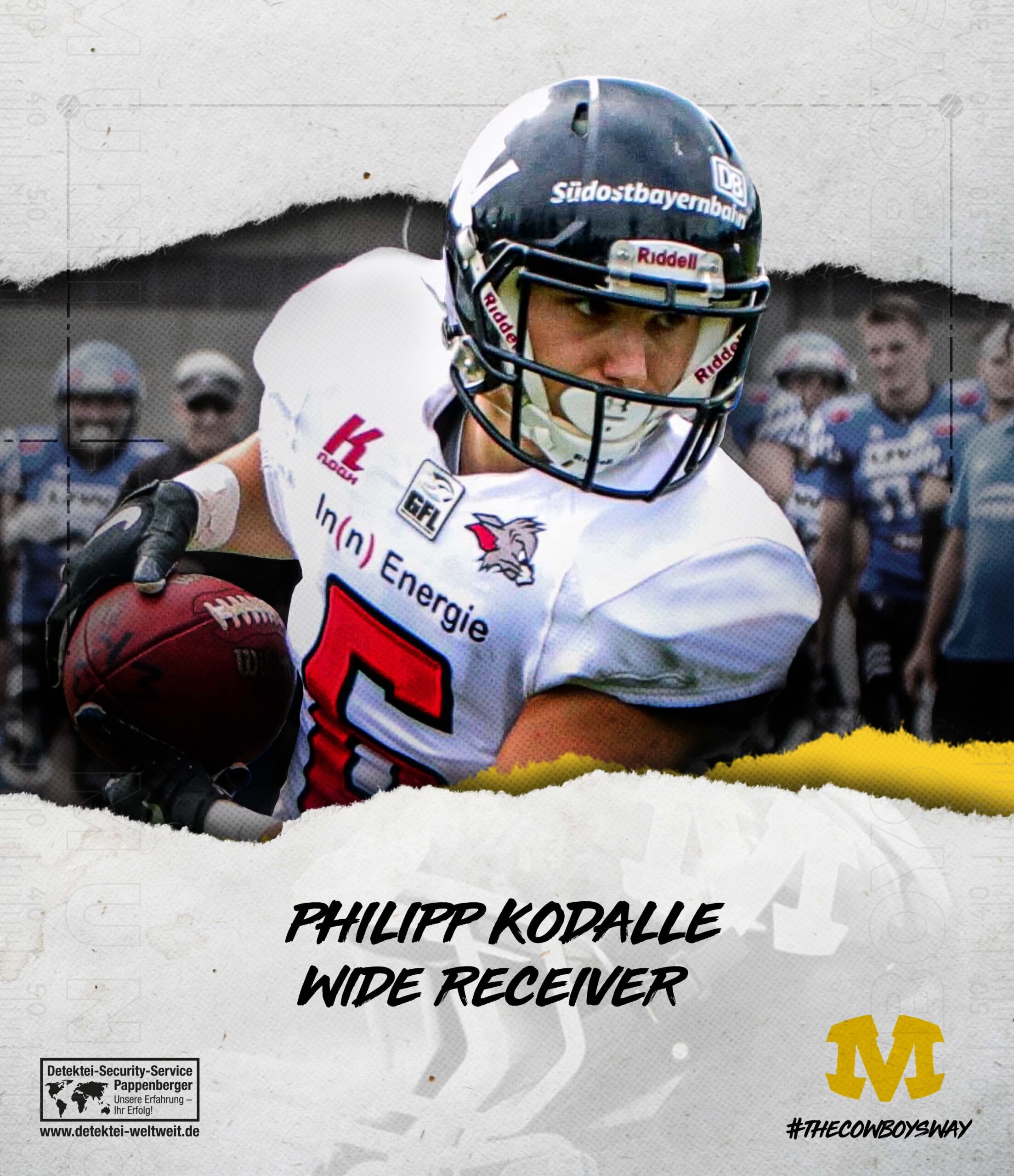 Von den Kirchdorf Wildcats kommt zur Saison 2020 Wide Receiver Philipp Kodalle zu den Munich Cowboys. Der 25-jährige Angreifer stand im vergangenen Jahr in 13 Partien für die Wildcats in der GFL auf dem Feld und war eine wichtige Komponente des Kirchdorfer Angriffs.