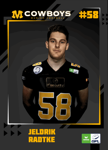 0. Nikita Chereminskiy1. Peter Tarantino2. Gabriel Boccella3. Zachary Whitehead4. Nicco Heiß5. Zerrian Meander6. Christoph Sass7. Dane Lynch Jr.8. Anton Chereminskiy9. Diego Emanuel10. Saber Chaar11. Luca Raue12. Erik Kandler13. Tobias Wagner14. Maximilian Mittasch15. Florian Gaul15. Elias Frank17. Lukas Anzeneder18. Erich Kilger19. Mustafa Othman-Khaldun20. Maximilian Mayer21. Haris Kovačević23. Emre Gökce24. Sascha Schnorrbusch25. Anton Liu26. Moritz Buchberger28. Laurenz Grassl31. Daniel Brandl32. Marcel Mayer41. Felix Almer42. Stefan Weiß48. Niklas Blöchl49. Stephan Ludwig52. Florian Wenta53. Mike Katschke54. Jakob Wagner56. Maximilian Weegen57. Vinzent Englmann58. Nicolas Klingshirn58. Jeldrik Radke59. Luis Maaßen61. Benedikt Vollert62. Noah Rimsky-Korsakow64. Tobias Tüttinghoff65. Antonio Grecuccio66. Sandro Wohn70. Christian Urban71. Luke DeVries74. Vincent Werfl76. Kilian Feuerstein77. Halim Jusufi80. Miguel Doege80. Ricardo Knocke81. Leo Casin81. Sebastian Reiner83. Manuel Hutter84. Fabian Kempter85. Magnus Christmann86. Jeremias Delgado92. Maximilian Wolf94. Johnny Cucchiara95. Vasilij Braun96. Manuel Zenn97. Elias Santamaa98. Sandy Wegner99. Godwin Badom #58NameJeldrik RadkeNationalitätDeutschlandPositionLinebackerGröße190Gewicht85Ehemalige MannschaftMUNICH COWBOYS