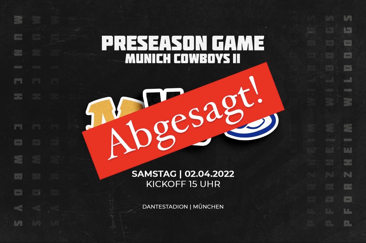 Das für Samstag, 2.04.2022 geplante Vorbereitungsspiel der 2. Herrenmannschaft der Munich Cowboys gegen die Pforzheim Wilddogs muss leider wegen den Witterungsverhältnissen und Platzsperre durch die Stadt München abgesagt werden. Bereits erworbene Tickets werden direkt über den Ticketshop zurückerstattet.