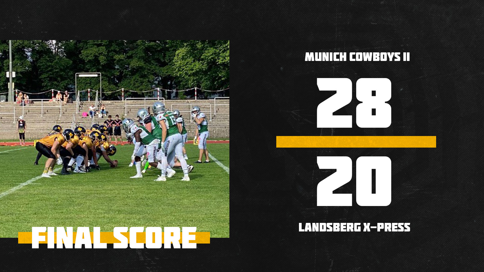 Die Munich Cowboys II holen im Spiel gegen den Express aus Landsberg die nächsten Punkte. Nach einer umkämpften ersten Halbzeit führten die Landsberger zwischenzeitlich mit 13:07. Touchdown auf Cowboys Seite erzielte Jacob Kempf nach Pass von Marinus Dinglreiter. Die Münchner kamen als stärkeres Team aus der Halbzeit und konnten durch einen langen Pass auf Nicco Heiss und einem Special Teams Touchdown durch Diego Emanuel im anschließenden Drive in Führung gehen. Nach einem weiteren Touchdown der Landsberger stand es dann zwischenzeitlich 21:20, bevor die Cowboys durch Marvin Lautermann mit 28:20 in Führung gingen und diese bis zum Ende verteidigten. Dies bedeutete den dritten Sieg im vierten Spiel. Bereits nächste Woche am 11.06. steht das Team von HC Raphael erneut im heimischen Dantestadion beim Rückspiel gegen die Erding Bulls auf dem Feld. Das Hinspiel in Erding konnte mit 30:20 gewonnen werden.