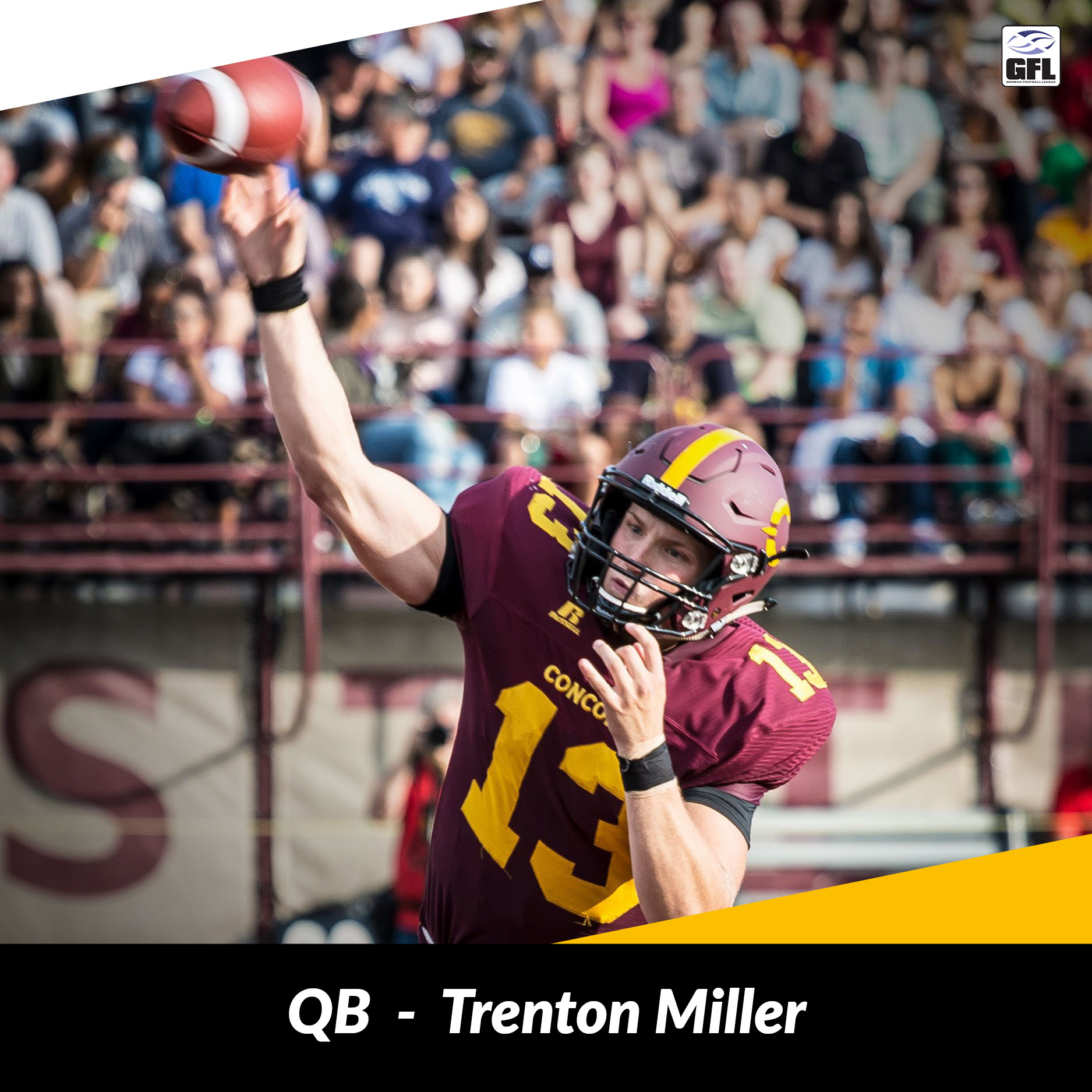 Seinen MBA erarbeitete sich der heute 23-jährige dann an der John Molson School of Business in Concordia. In drei Jahren als Starter setzte er mehrere Schulrekorde, wurde zum RSEQ Conference Offensive Player nominiert und war Zweitplatzierter für den National Hec Creighton Award, Kanadas Heisman Trophy, als Top Spieler auf nationaler Ebene. Zusätzlich nahm der US-Amerikaner an drei Training Camps der Canadian Football League teil. Trenton Miller ist Gründer der NextGen Quarterback Academy und gibt hier seine Erfahrungen an junge Quarterbacks weiter.