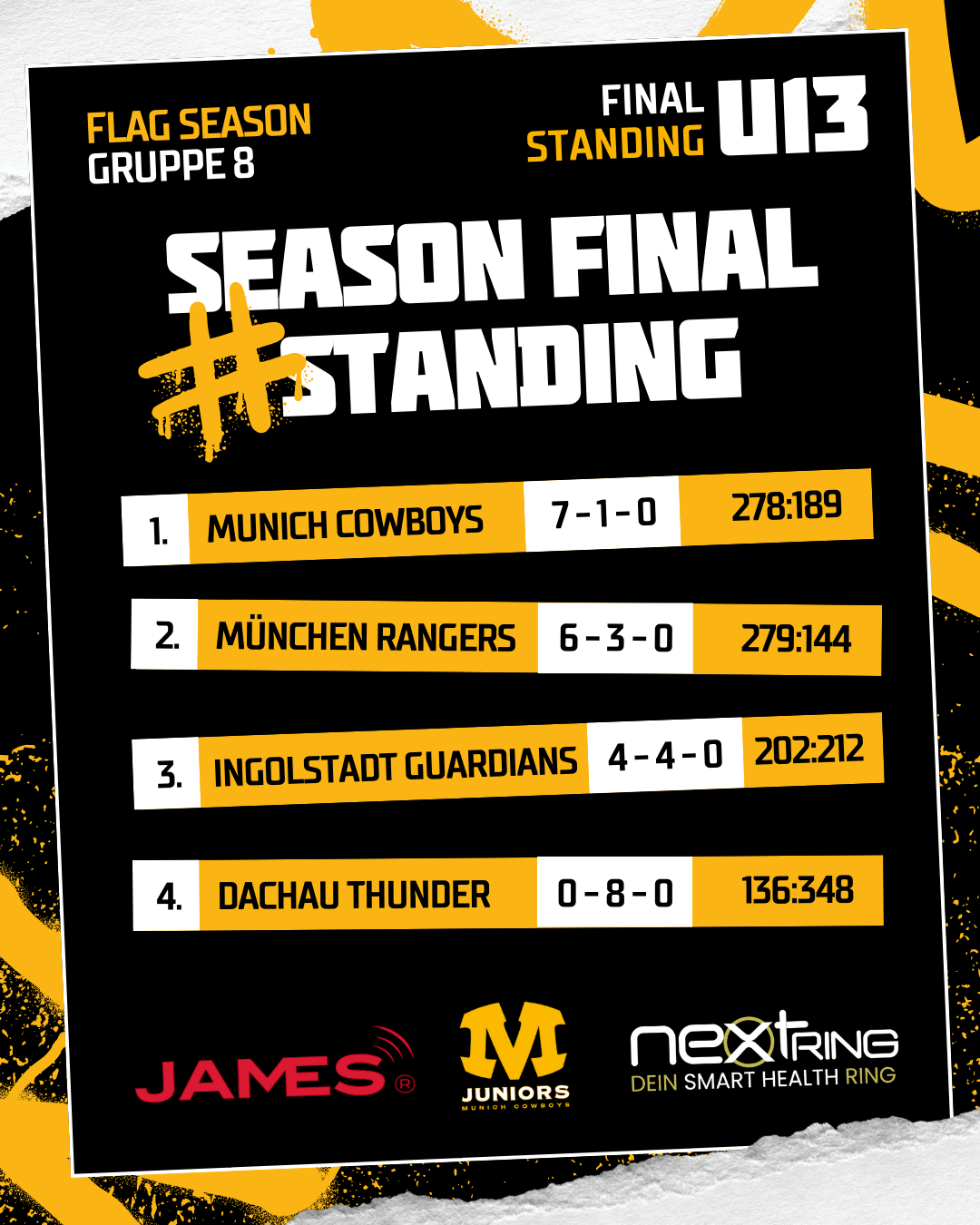 Auch wenn die Ergebnisse gegen Dachau immer recht deutlich aussahen, muss man sagen, dass die Thunders U13 eine tolle Leistung brachte. In den meisten anderen Gruppen im Süden wären sie nicht ohne Sieg aus der Saison gegangen. Aber die Cowboys waren auch am Samstag wieder einen Tick besser und konnten auch dieses Aufeinandertreffen mit 50:24 für sich entscheiden.