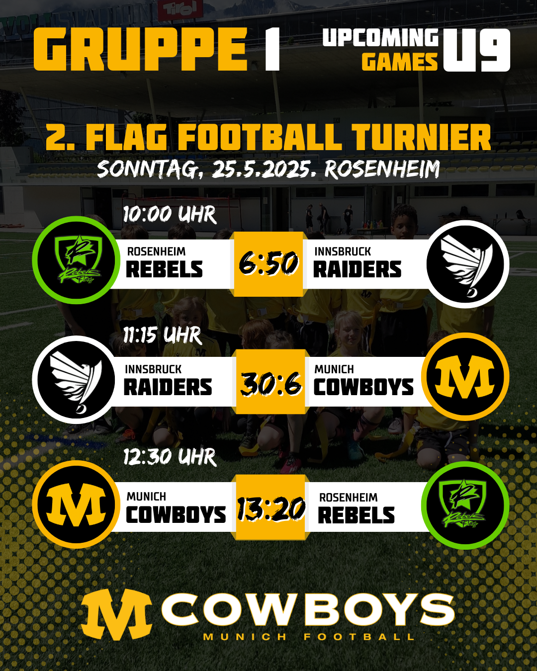 Im ersten Spiel trafen die jüngsten Cowboys auf die Gäste aus Innsbruck. Während man im 1. Turnier noch mit 52:6 unter die Räder kam, konnte man heute das Ergebnis etwas besser gestalten und verlor dieses Mal „nur“ mit 30:6. Ist also schon eine Steigerung zu sehen.