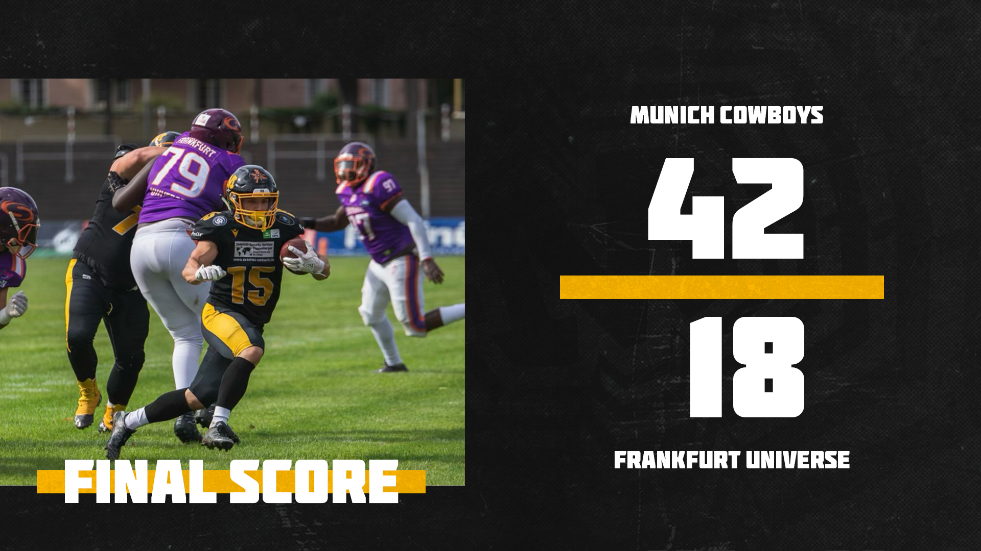 Auch mit einer personell sehr stark veränderten Mannschaft schaffen die Munich Cowboys im letzten Spiel der Hauptrunde einen 42:18-Sieg gegen Frankfurt Universe. Dabei starteten die Hausherren etwas ruckelig. Schon nach zwei Minuten konnte Frankfurts Defensive Back Theo Haas einen Pass von Wyatt Smith abfangen. Folgerichtig sollten die Gäste die ersten Punkte auf das Scoreboard bringen. Quarterback Theo Landers passte auf Wide Receiver Brandon Butler zur 6:0-Führung für die Hessen. Dies ließen die Münchener aber nicht unbeantwortet. Mitte des Viertels bediente Spielmacher Wyatt Smith Wide Receiver Jannik Nowak zum 7:6. Insgesamt wirkte die Offense der Munich Cowboys aber in einigen Situationen weiter unkonzentriert.
